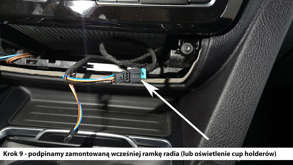 Retrofit wiązki, która umożliwia dołożenie i podpięcie w systemie "Plug&Play" podświetlanej ramki radia lub diody na cup holdery.